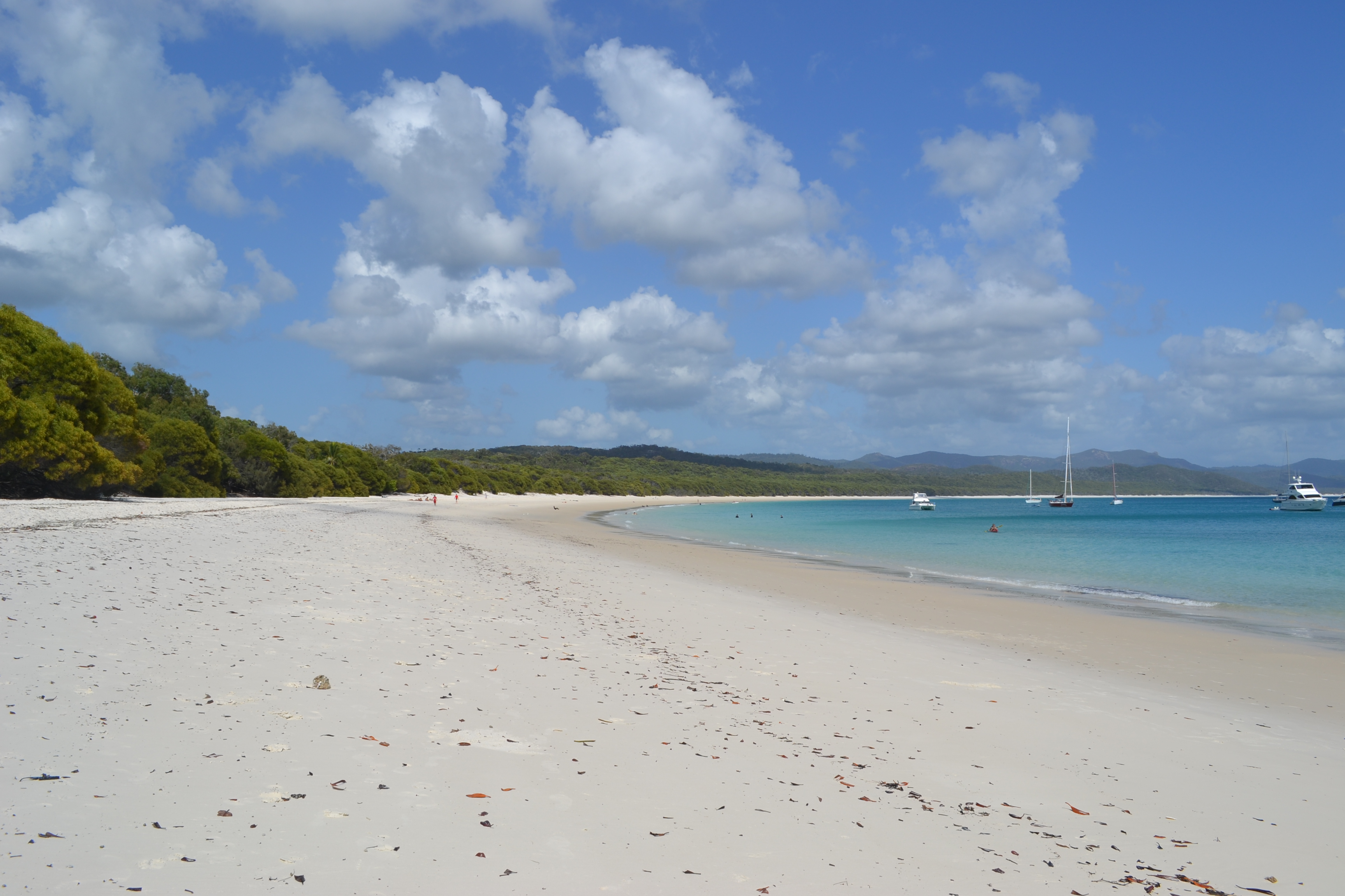 Nach der einstündigen Überfahrt kamen wir gegen halb zwei in Whitehaven Beach an. Wir waren vorher etwas besorgt, dass unsere hohen Erwartungen (geweckt durch zahlreiche Erzählungen a la „der schönste Strand, an dem ich je war“) nicht erfüllt werden konnten, doch diese Besorgnis stellte sich als völlig unbegründet heraus. Schon direkt nach der Landung waren wir schlichtweg geplättet von der Schönheit der Natur, die sich hier schwer ausdrücken lässt. Sowohl Farbe als auch Konsistenz des Sandes ist hier wahnsinnig toll, er hebt sich farblich kaum vom weiß der Möwen ab, die hier teilweise unterwegs sind und besteht aus feinem Pulver. Das Wasser ist traumhaft blau. Abgerundet wird die Aussicht durch den sattgrünen Wald, der sich direkt an den strahlend weißen Strand reiht und unseren Campingplatz beherbergt.