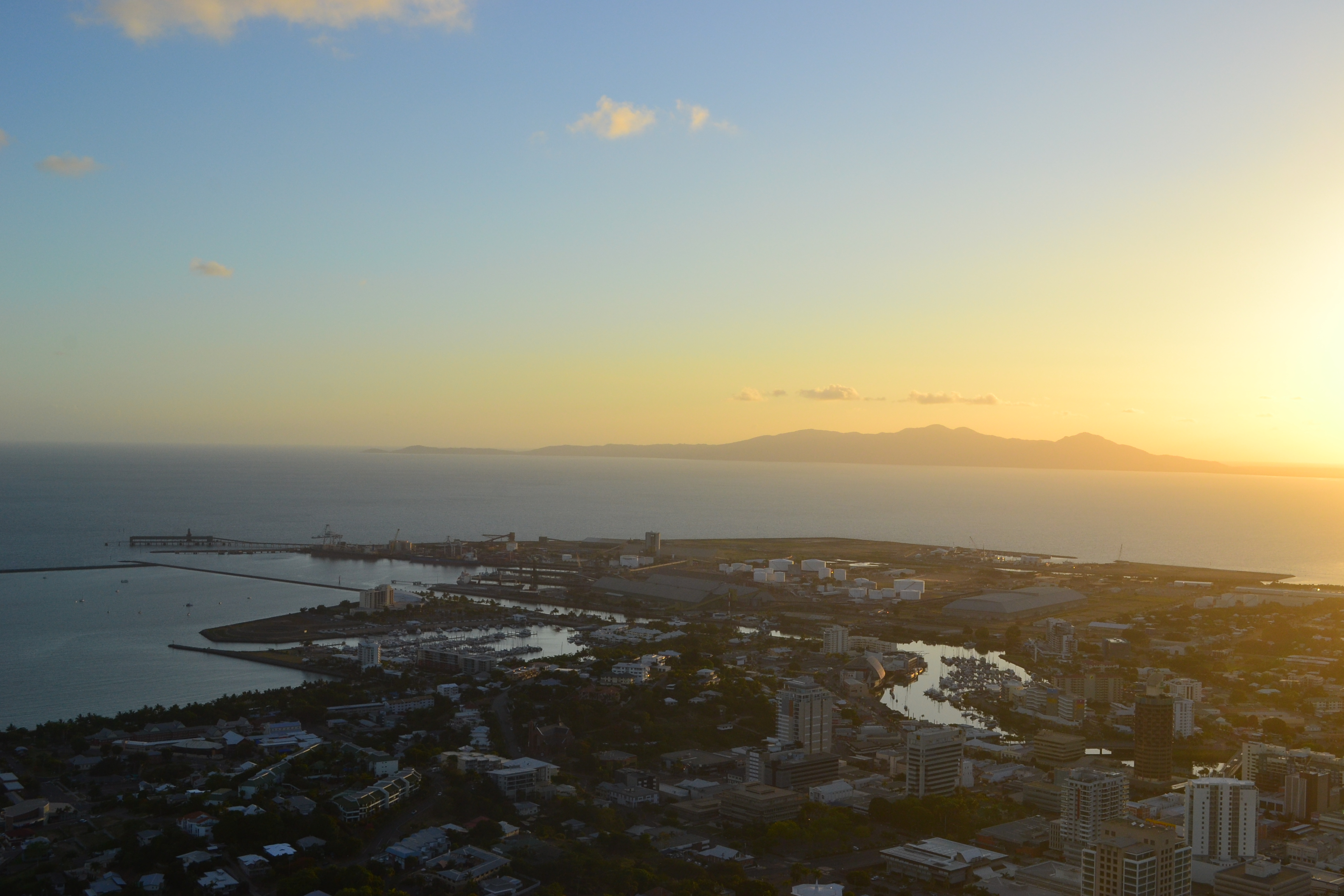 Nach einer furchtbaren Nacht im Mietwagen wachten wir schon um kurz nach 5 Uhr mit dem Sonnenaufgang auf und beschlossen kurzfristig, hoch nach Castle Hill zu fahren, ein knapp 300 m hoher Hügel inmitten der Stadt. Auf dem Weg nach oben bekamen wir ein schlechtes Gewissen – ganz Townsville schien hier oben per pedes oder auf dem Rad Frühsport zu treiben und wir schlichen uns völlig verschlafen im Auto vorbei. Der Anblick ließ uns aber schnell unser unsportliches Touri-Dasein vergessen – eine sensationelle Rundumsicht bei wolkenlosem Himmel und grade aufgehender Sonne braucht wohl keine weitere Beschreibung.