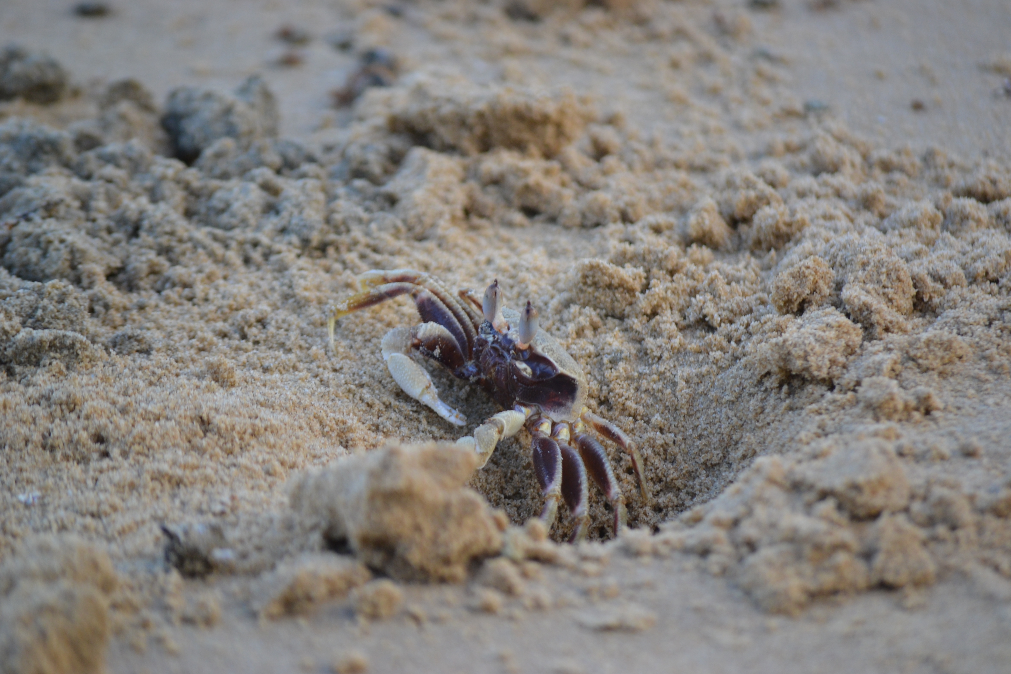 Nach dem Ausschlafen und dem aus Kings Cross bekannten reichhaltigen Jackaroo-Frühstück machten wir uns mit dem Auto daran, die Gegend zu erkunden. Wir erforschten Laceys Creek mittels eines Walkways und verbrachten den Großteil des Tages am Strand selbst. Mission Beach ist ein außergewöhnlich schöner und ewig langer Sandstrand. Wir verbrachten viel Zeit mit quatschen, spazieren gehen und Fotos schießen (modelmesisch auf einer Palme sitzen ist verdammt ungemütlich). Relativ schnell sahen wir, dass der ganze Strand mit unterschiedlich großen, oft aber sehr kleinen Sandkugeln übersät war. Blieb man stehen, konnte man schnell sehen, dass der ganze Strand in Bewegung war, Krebse aller Größen trieben hier ihre rätselhaften Geschäfte – 12 Stunden lang Tunnel graben, bis zur nächsten Flut.