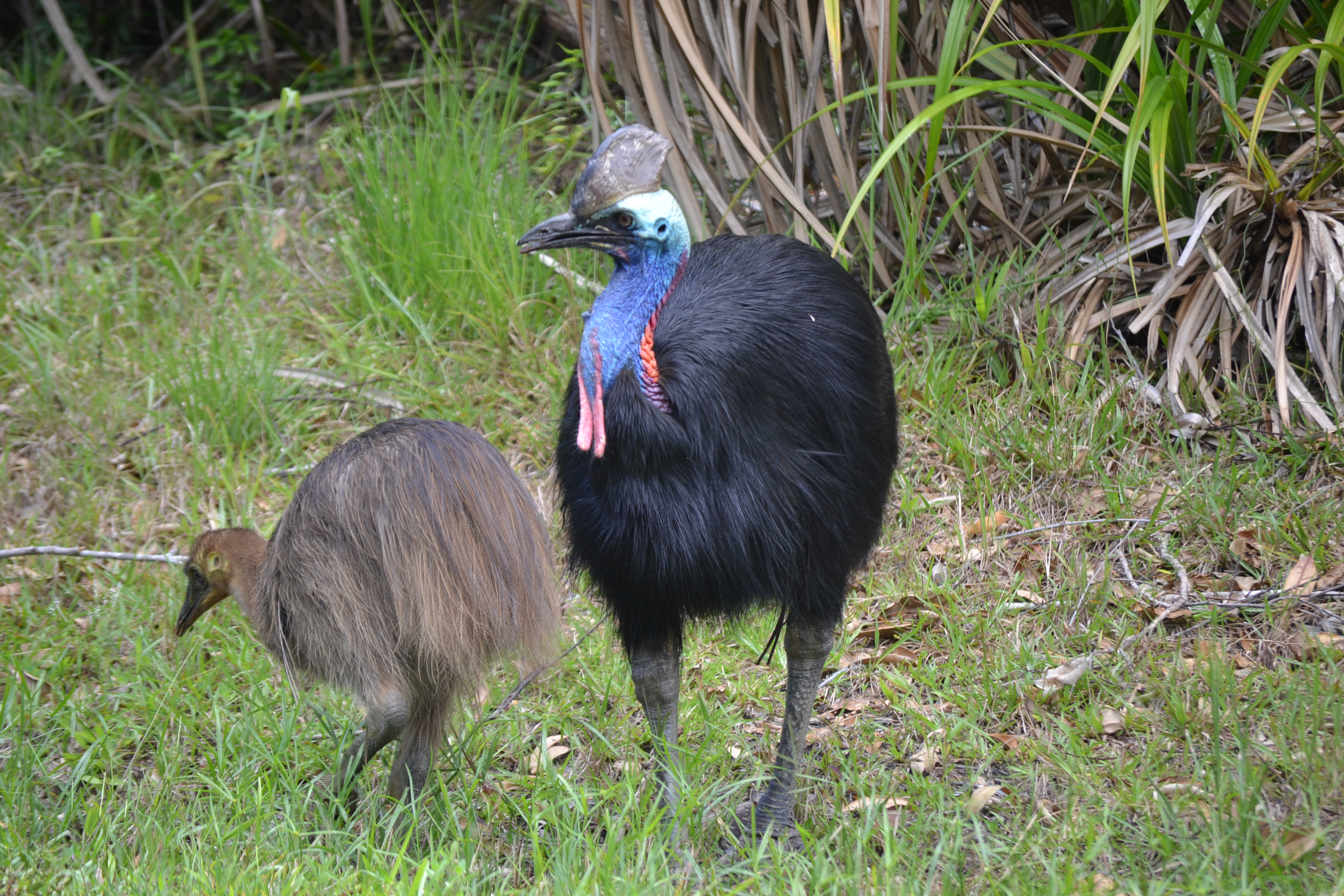 Die Ostküste ist echt schön. Das stellten wir heute zum wiederholten Male fest. Nach dem Auschecken hielten wir kurz am Clump Point Jetty, in der Nähe von Mission Beach und genossen die Aussicht vorne auf der Seebrücke. Hier entlang der Küste trifft der Regenwald direkt den Strand und das Meer. Also „rainforest meets reef“ und ist damit Weltnaturerbe – einzigartig. Nach kurzem Zwischenstopp bei Woolworth – wir hatten grade festgestellt, dass es sehr schade ist, die Cassowary Coast zu verlassen, ohne einen einzigen dieser seltenen Vögel zu sehen, bot sich für uns doch noch dieser tolle Anblick – ein Cassowary inklusive Küken am Straßenrand. Diese vom Aussterben bedrohten, fluglosen Vögel sind emugroß und machen den Anschein, die letzten Überlebenden aus der Dinosaurierzeit zu sein.