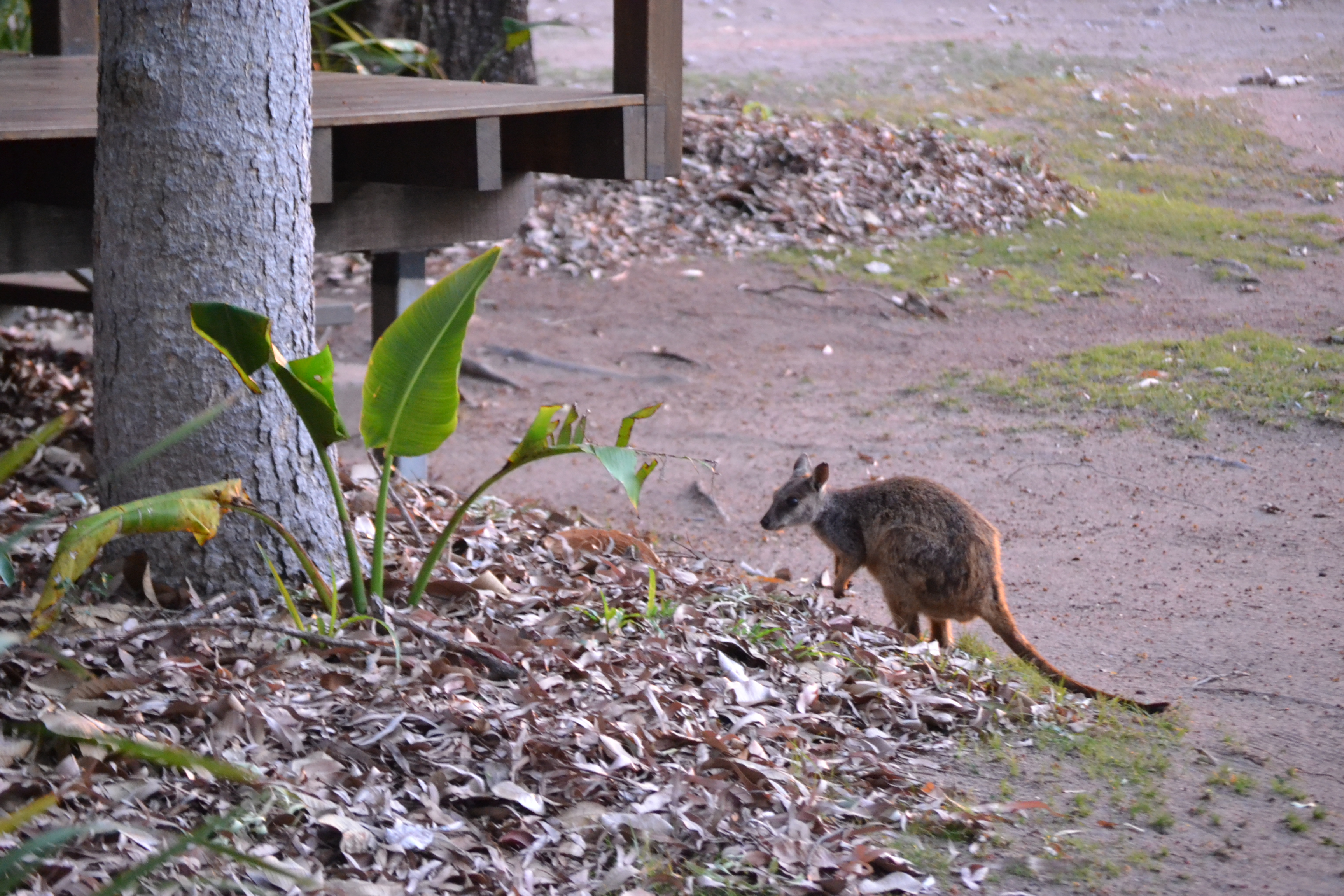 Nach dem Abendessen gönnten wir uns ein Bier / einen Cider an der Bar. Wie schon in Mission Beach ist hier alles sehr offen gestaltet – schlechtes oder gar kaltes Wetter gibt es hier nicht. So sitzt man auch an der Bar unter kunstvoll ineinander verschachtelten Blechdächern im Freien. Auch Baumstümpfe sind in das Konzept mit eingearbeitet worden. Generell hat das Hostel ein ungewöhnliches Konzept – es gibt viele kleine Bungalows mit spitz zulaufenden Dächern in einem offenen Gelände, zwischen den Hütten laufen einem immer wieder Wallabies, Vögel oder Opossums über den Weg und zum Hostel gehört noch ein Wildgehege. Das Gefühl, auf einer Insel zu sein, vervollständigt die tolle Atmosphäre des YHA.
