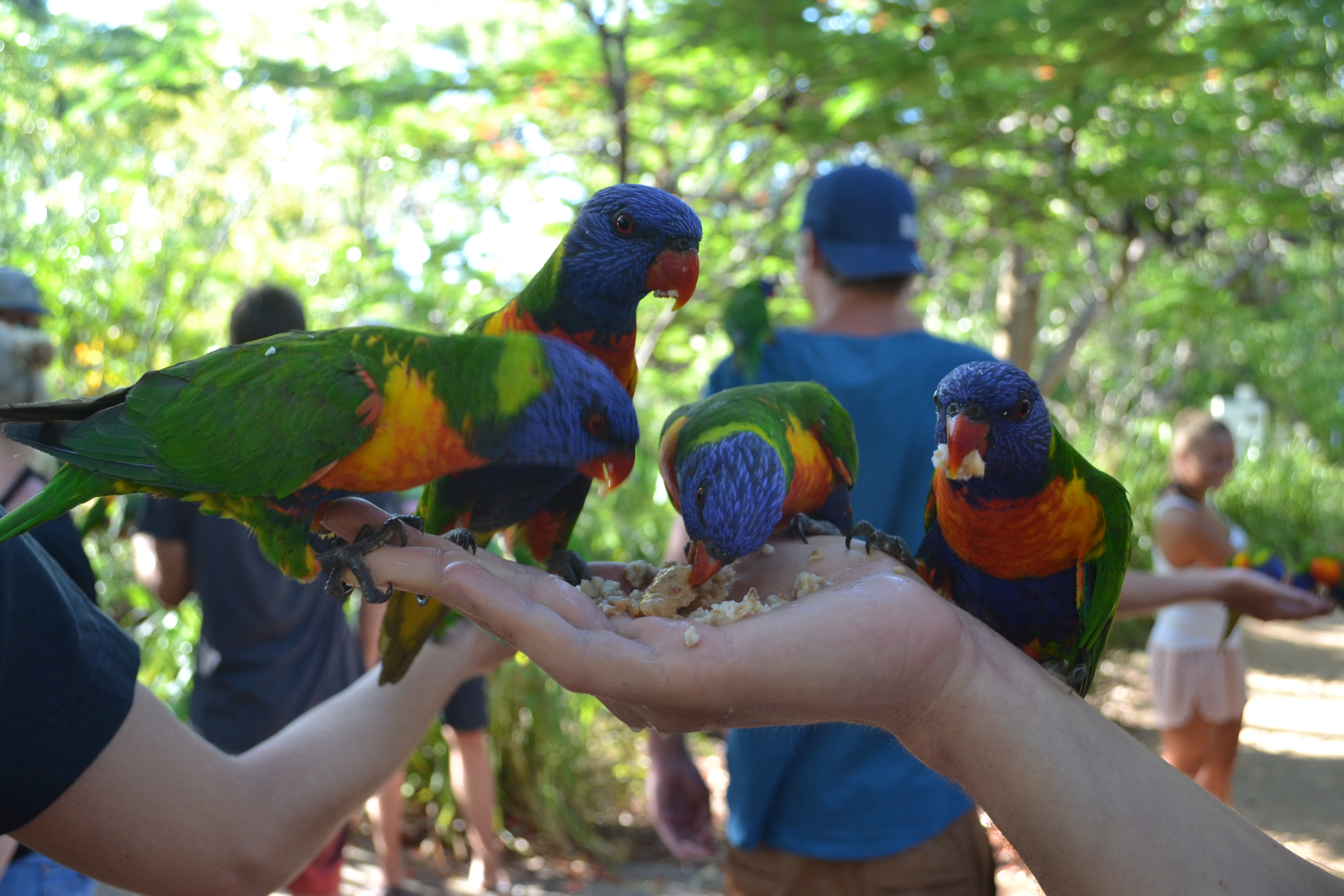 Um 16.30 Uhr allerdings gab es die alltägliche Papageienfütterung (mit einem leckeren Brei aus Brot, Honig und Wasser), jeder Gast des YHA darf hier zugreifen. Einmal die Hand in der Luft dauert es nicht lange, bis sich die ersten der zutraulichen Vögel auf selbige setzen und sehr vorsichtig den Brei herunterpicken. Innerhalb kürzester Zeit sind die Papageien überall, auf den Schultern, auf dem Kopf, drei oder vier gleichzeitig auf der Hand. Auch auf dem Boden bilden sich Papageientrauben, ein lautes Spektakel.