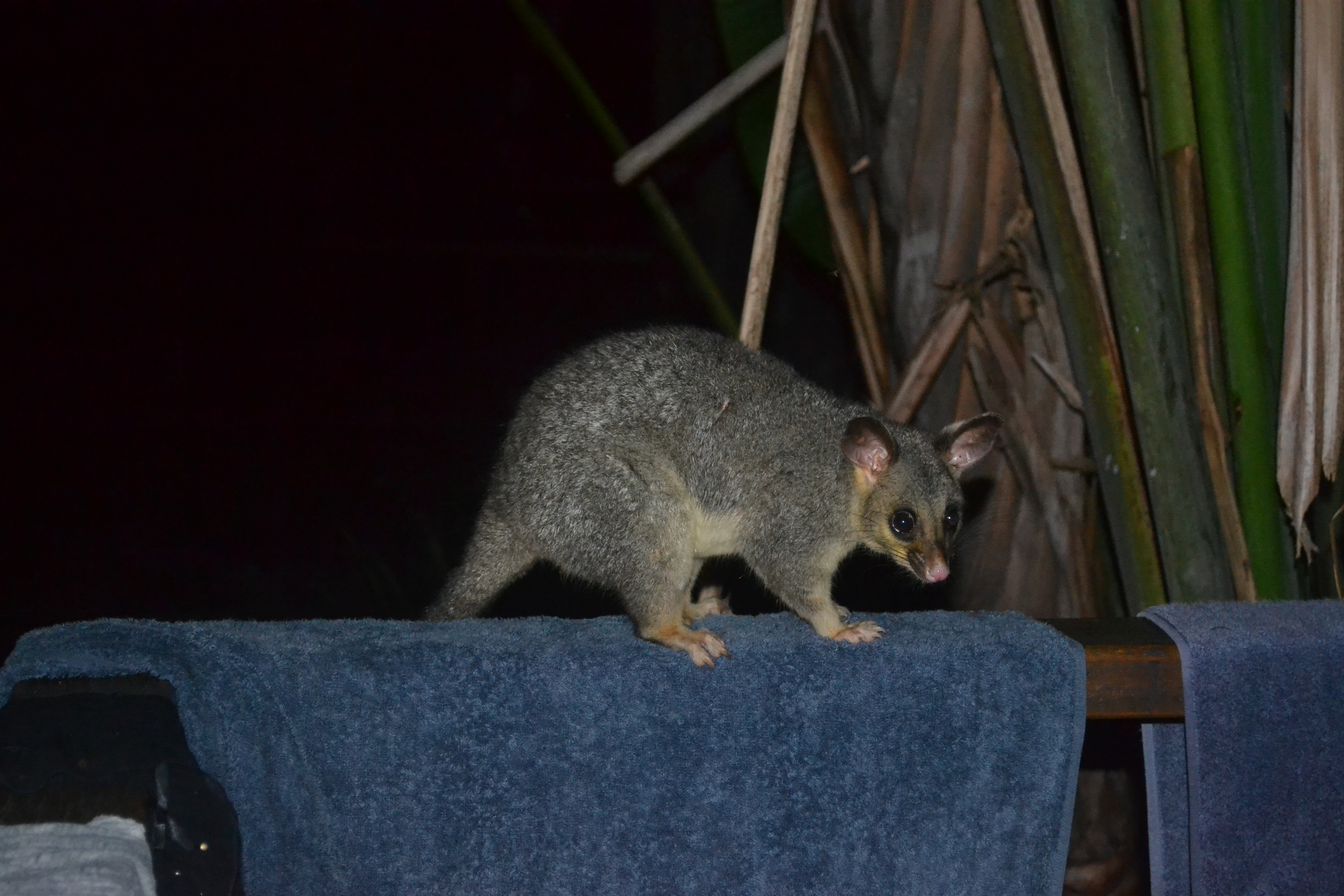 Danach ging es auch für mich Richtung Hostel, ich war sehr geschafft. Wir ließen den Abend zunächst im Pool, nach dem Essen quatschend auf der Veranda ausklingen. Auch heute besuchte uns Opi, das Oppossum wieder und kletterte auf den Platz am Geländer. Es blieb lange sitzen und störte sich auch nicht daran, dass wir nichts zu essen gaben. Wie schon gestern, schnupperte es schließlich an meinem Fuß und machte sich lange nach 22 Uhr auf den Weg in die Nacht.