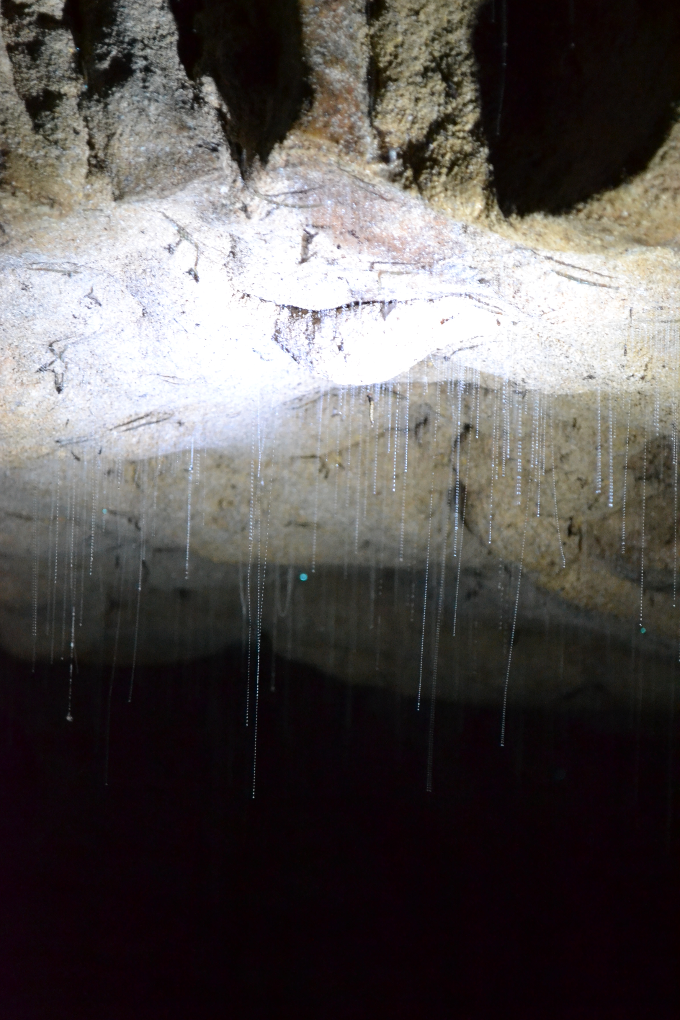 Die Glühwürmchen und die Fäden, in denen sich ihr Futter (Fliegen etc.) verfangen soll. Das Leuchten dient hier also nicht zur Paarung wie bei den europäischen Verwandten.