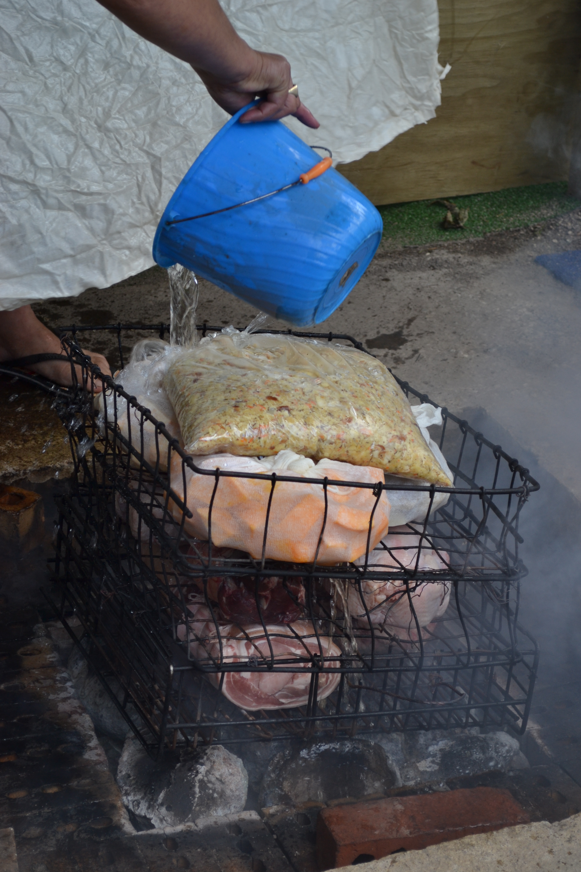 Unser Festmahl! Hier wird zum Dampfgaren noch etwas Wasser auf die heissen Steine geschüttet.