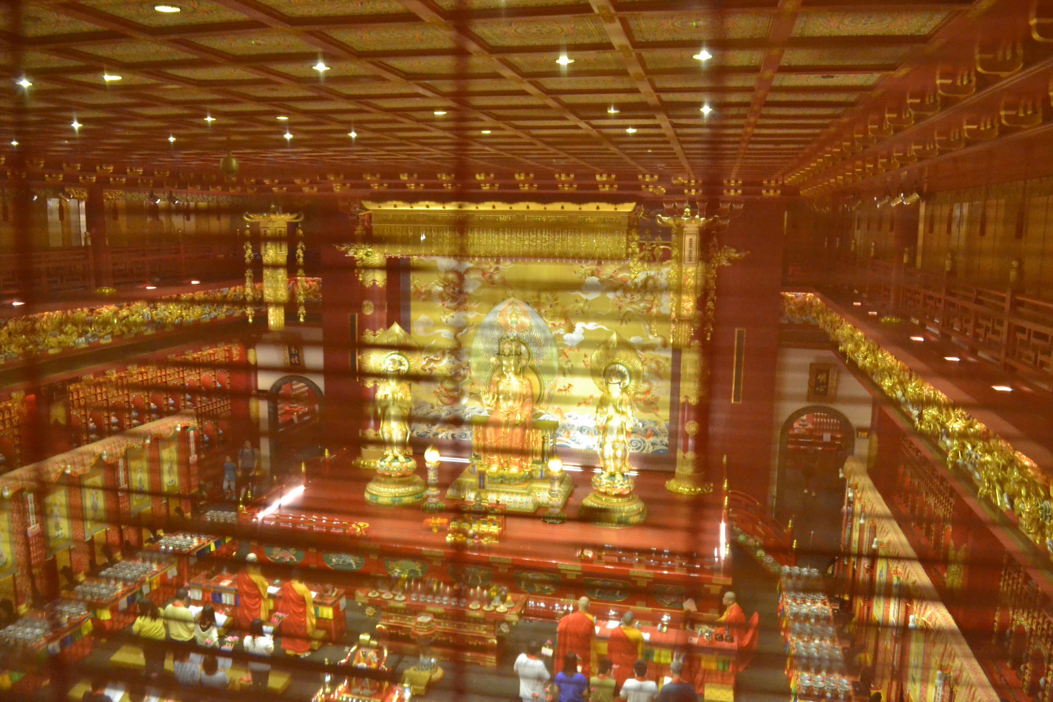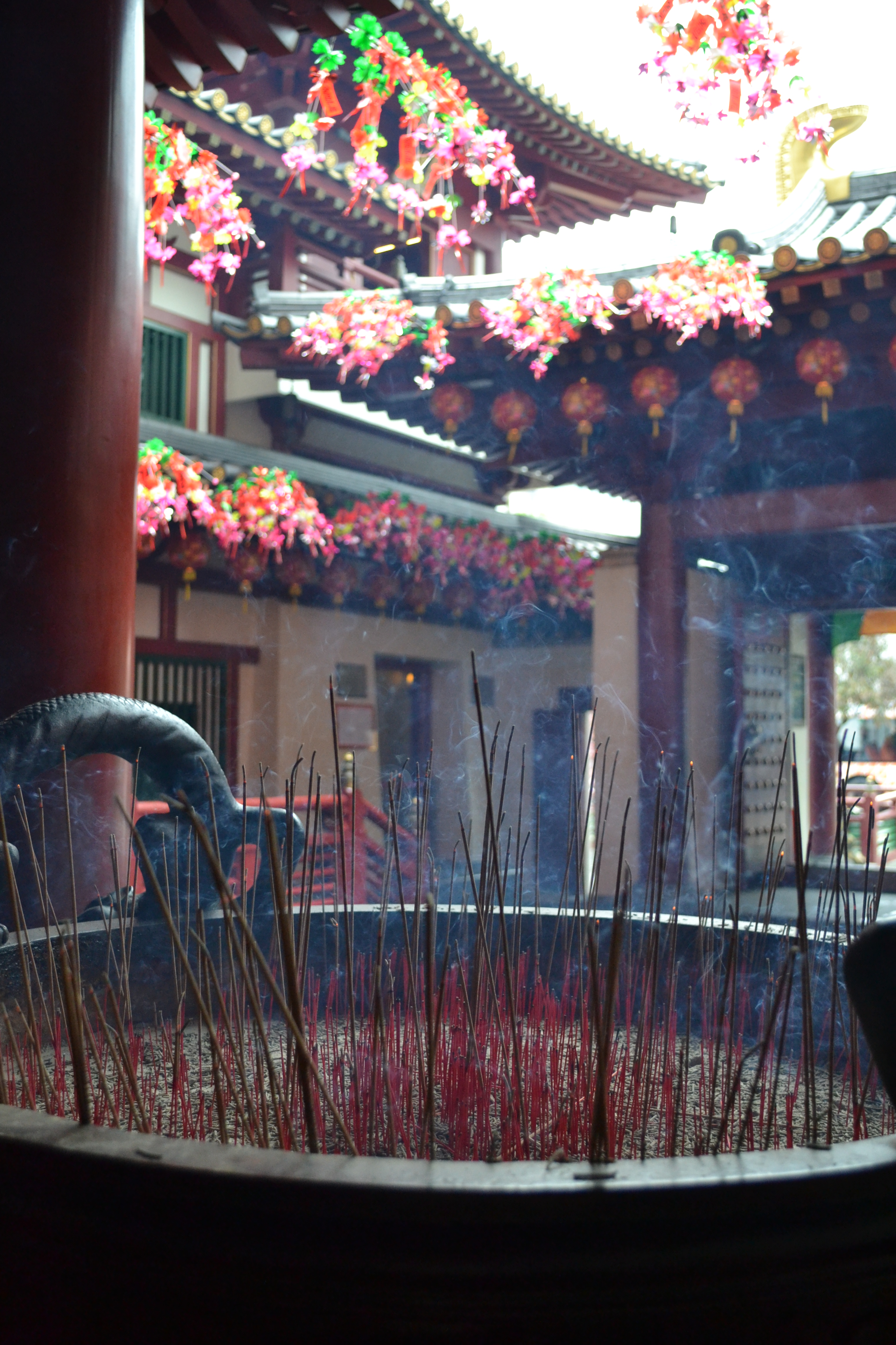 Um 8.30 Uhr standen wir auf, Johann, Dominik und ich statteten dem Bäcker in der Mall um die Ecke einen Besuch ab. Nach einem ausgiebigen Frühstück verabschiedeten wir uns zunächst von unseren Gastgebern, um Chinatown zu erkunden. Das Viertel ist sehr hübsch und gerade jetzt kurz vor dem chinesischen Neujahr (am 31.01. startet das Jahr des Pferdes) bunt geschmückt. Die Massen drücken sich hier durch, es gibt viel zu entdecken. So auch Stätten dreier verschiedener Religionen – eine Moschee schauten wir uns an, besichtigten einen hinduistischen Tempel und den krönenden Abschluss bildete der 2008 für 75 Mio S$ (ca 45 Mio EUR) errichtete Buddha Tooth Relic Temple. Hierbei handelt es sich um einen sehr beeindruckenden Tempel, dem man locker einige Stunden widmen kann. Den zentralen Raum findet man im vierten Stock, inmitten eines prächtig geschmückten Raumes steht hier ein massiver, 420 kg schwerer Goldklotz, in dessen Mitte man die dem Tempel seinen Namen verleihenden Überreste eines Zahnes von Buddha bestaunen kann.