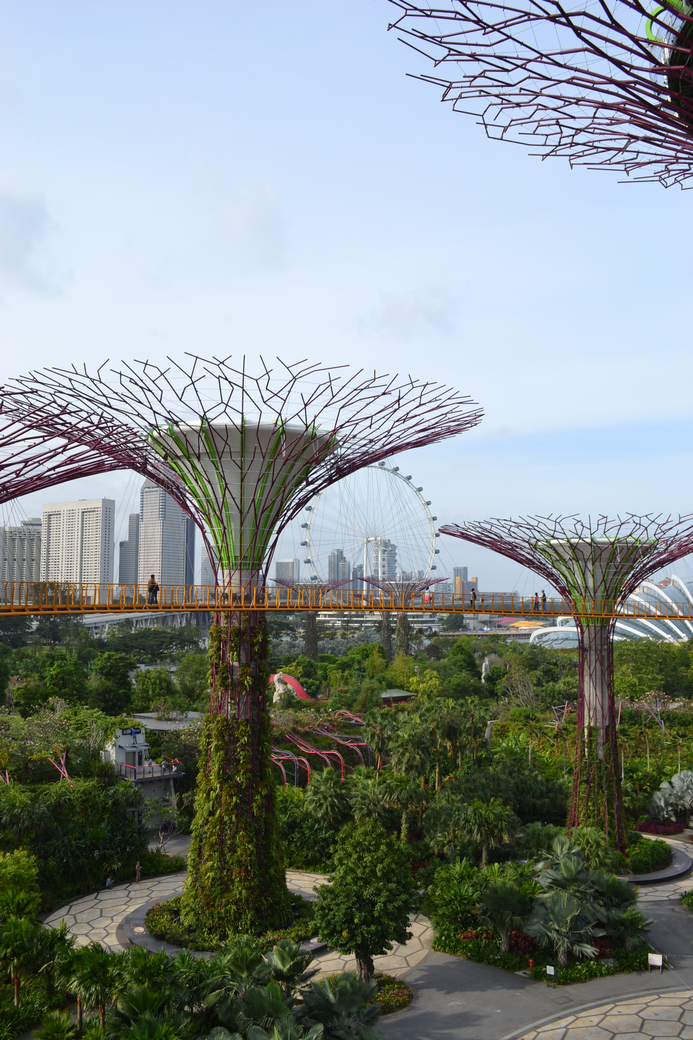 Unser nächstes Ziel an dem Tag war Marina Bay. Der komplette Bereich wurde in den letzten Jahren aufgeschüttet, vorher gab es hier nur Meer. Wir schauten uns die Gardens by the Bay an mit ihren Supertrees, metallene Konstruktionen, an denen Pflanzen gedeihen und die man auch besteigen kann. Der ganze Bereich ist stark auf Nachhaltigkeit angelegt, auf den Dächern der Supertrees liegen Solarpanels und die aus dem dort entstehenden und direkt verwerteten Müll gewonnene Energie wird dazu verwendet, die zwei großen Gewächshäuser zu kühlen, die man sich gegen Eintritt anschauen kann. Dominik fütterte uns später mit vielen Informationen, so erfuhren wir auch, dass der Bereich der Supertrees erst 2012 eröffnet wurde.