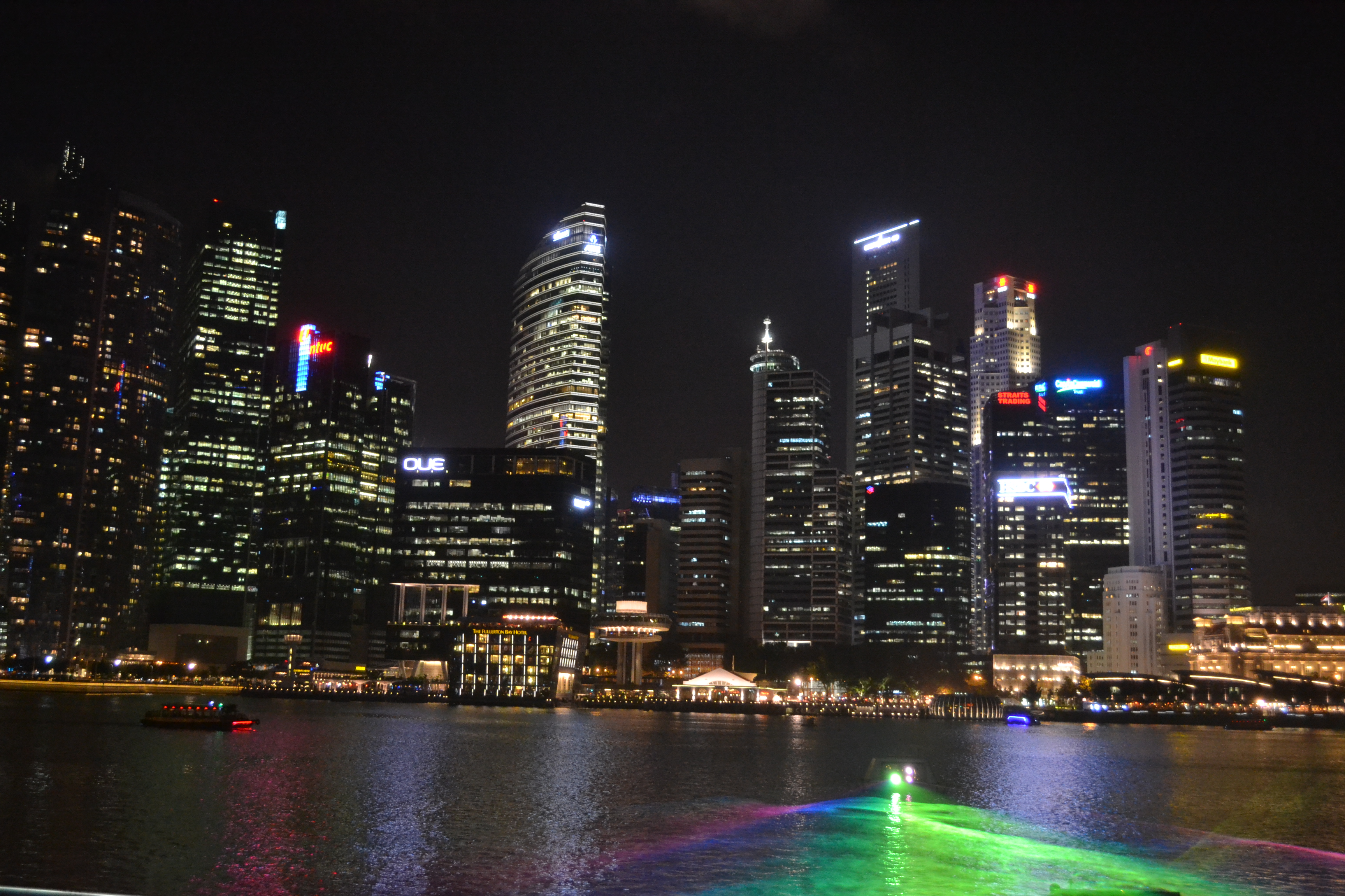 Im Anschluss erkundeten wir weitere Teile der Stadt spazierend, wir liefen am Parlament vorbei, über den Fluss, hinein in den gut in die Stadt integrierten Central Bank District CBD. Unsere Gastgeber führten uns schließlich auf die Dachterrasse des Fullerton Bay Hotels, dort genossen wir die tolle Aussicht auf die Bucht und den die Gegend beherrschenden Marina Bay Sands-Komplex. Bei einem Whisky bzw. Cocktail bewunderten wir die Lasershow, die hier täglich gezeigt wird, ähnlich der Symphony of Lights, die wir in HK gesehen hatten.