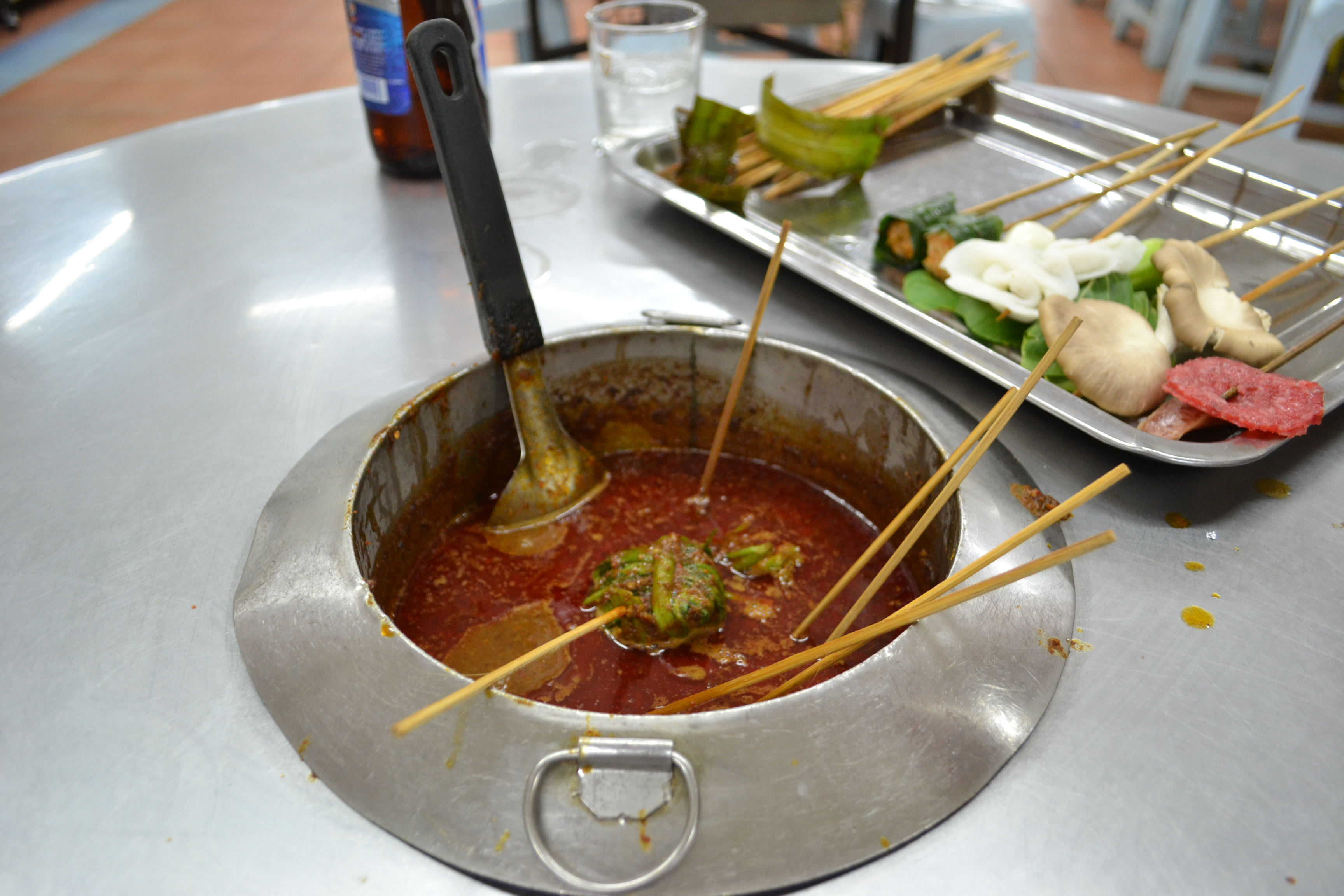 Wir aßen zu Abend bei Satay Celupe – hier sitzt man um einen runden Edelstahltisch, in dessen Mitte eine Erdnusspaste – mit 26 verschiedenen Gewürzen verfeinert und 18 Stunden lang gekocht – vor sich hin blubbert. Aus mannshohen Kühlschränken holt man sich Stäbchen mit unterschiedlichen Lebensmitteln, von Garnelen und Fisch über Tofu und Gemüse bis hin zu Fleisch und einigen unidentifizierbaren Leckereien (zu jeweils 0,70 Ringgit, als knapp 20 Cent) und lässt diese nach Wunsch länger oder weniger lang im Topf. Wir aßen einiges, von dem wir nicht wussten, was es war, aber das meiste schmeckte sehr lecker und richtige geschmackliche Enttäuschungen gab es nicht. Alles zusammen landeten wir bei knapp 15 Euro, davon ging die Hälfte für meine zwei 680ml-Tiger Bierplomben drauf.