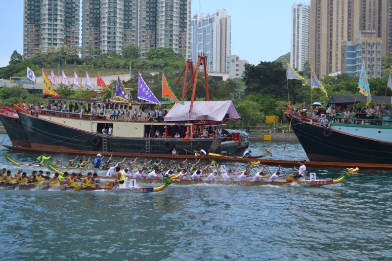Vergangenen Dienstag konnten wir dann den Strandaufenthalt mit einer weiteren chinesischen Tradition verknüpfen – es war Feiertag, des Dragon Boat Festivals wegen. Wie der Name schon erahnen lässt, finden hierbei im ganzen Land Drachenboot-Rennen statt. Wir standen früh auf und starteten den Tag bei einem der größeren Rennen in Stanley, außerhalb Hongkongs. Hier gibt es mehr als 30 Rennen mit jeweils 12 Teams – in einem Drachenboot sitzen meist zwischen 16 und 20 Personen. Dementsprechend waren nicht nur viele Zuschauer (an Land wie auch auf dem Wasser in größeren und kleineren Yachten) vor Ort, auch die Teams machen einen beträchtlichen Teil des Spektakels aus. Die größeren Firmen (Banken, Versicherungen etc.) sind hierbei durch die Bank weg vertreten und auch verschiedene private Teams gibt es, so z.B. auch zwei deutsche Drachenboot-Teams. Der Sport ist eine beliebte Freizeitbeschäftigung, auch unter Expats. Die Mannschaften trainieren oftmals das Jahr über auf den großen Tag hin. An der Namensgebung des Teams erkennt man jedoch leicht den Grad der Motivation. So liefen wir bspw. am Teamzelt der “Cheese Burgers” vorbei, die mehr oder minder angetrunken am Strand dösten. Ingesamt war die Stimmung toll, wir hatten uns einen Platz mit guter Aussicht gesichert und schauten uns mehrere Rennen an.