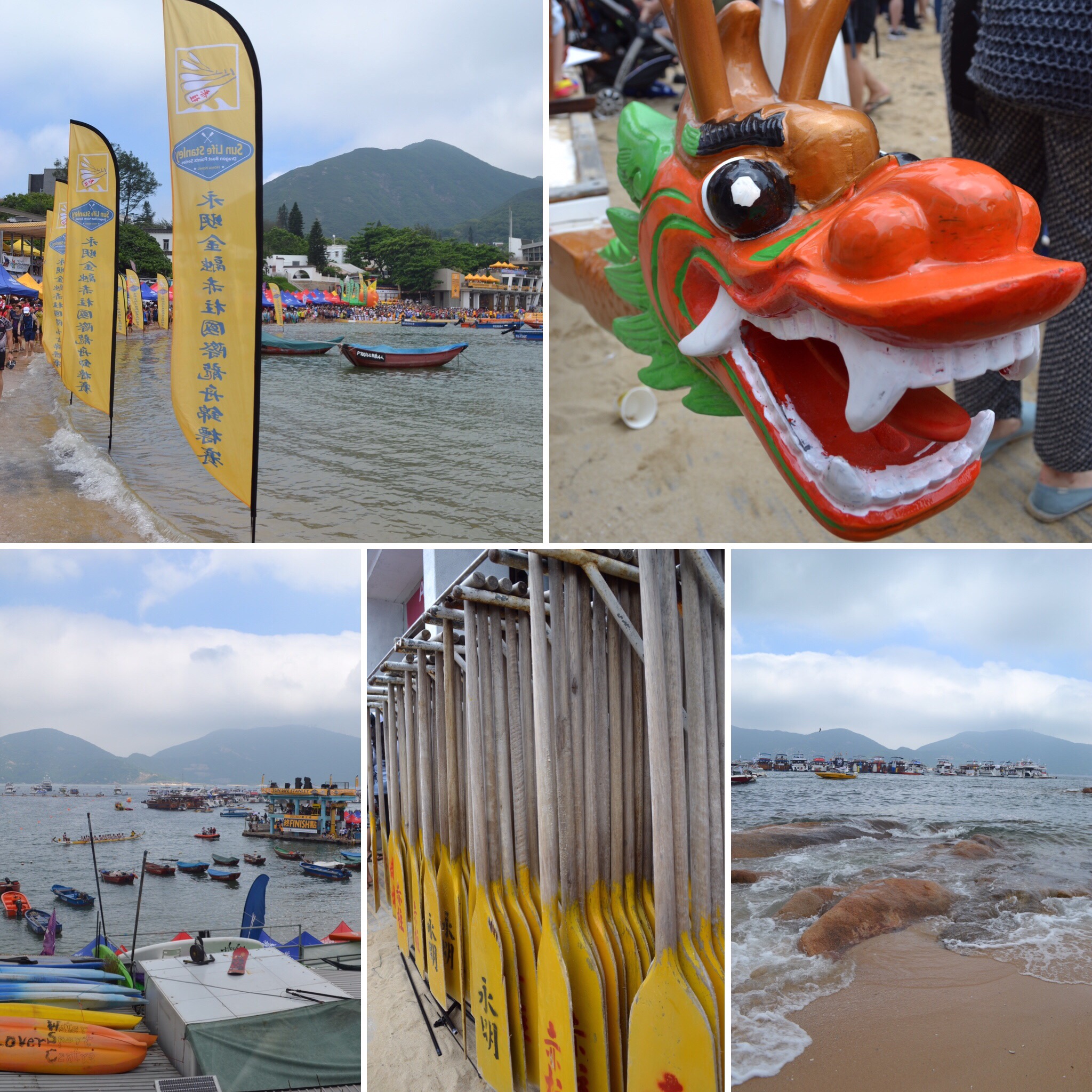 Vergangenen Dienstag konnten wir dann den Strandaufenthalt mit einer weiteren chinesischen Tradition verknüpfen – es war Feiertag, des Dragon Boat Festivals wegen. Wie der Name schon erahnen lässt, finden hierbei im ganzen Land Drachenboot-Rennen statt. Wir standen früh auf und starteten den Tag bei einem der größeren Rennen in Stanley, außerhalb Hongkongs. Hier gibt es mehr als 30 Rennen mit jeweils 12 Teams – in einem Drachenboot sitzen meist zwischen 16 und 20 Personen. Dementsprechend waren nicht nur viele Zuschauer (an Land wie auch auf dem Wasser in größeren und kleineren Yachten) vor Ort, auch die Teams machen einen beträchtlichen Teil des Spektakels aus. Die größeren Firmen (Banken, Versicherungen etc.) sind hierbei durch die Bank weg vertreten und auch verschiedene private Teams gibt es, so z.B. auch zwei deutsche Drachenboot-Teams. Der Sport ist eine beliebte Freizeitbeschäftigung, auch unter Expats. Die Mannschaften trainieren oftmals das Jahr über auf den großen Tag hin. An der Namensgebung des Teams erkennt man jedoch leicht den Grad der Motivation. So liefen wir bspw. am Teamzelt der “Cheese Burgers” vorbei, die mehr oder minder angetrunken am Strand dösten. Ingesamt war die Stimmung toll, wir hatten uns einen Platz mit guter Aussicht gesichert und schauten uns mehrere Rennen an.